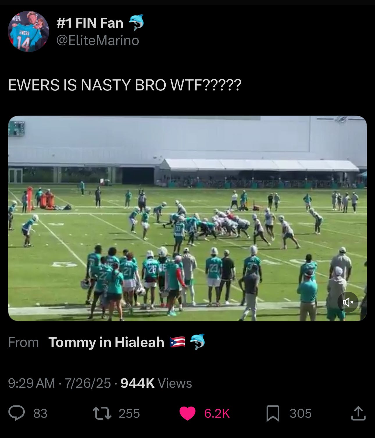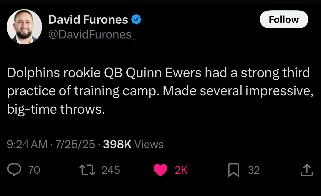 So far, it looks like he could be Auragens’ best endorsement ever if he can stay healthy, because Quinn has flashed at training camp. While there is some reporting of up-and-down play where Ewers “looks like a 7th round draft pick” (Alex Dunlap, Orangebloods), the twittersphere is all aboard the Quinntavious Train. Some of my favorite Dolphins training camp tweets about his stellar Friday and Saturday performances: